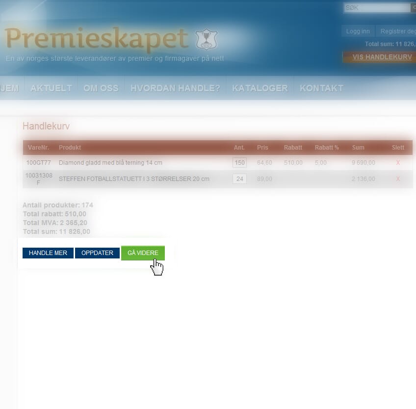 5. Kontroll av innhold i handlekurven/send bestilling Du får nå vist innholdet i handlekurven, sjekk at dette er riktig. For å sende bestillingen trykker du på knappen "Bekreft".Hvis du ønsker å legge til flere varer klikker du på knappen "Hjem" i toppmenyen, og velger deretter varegruppe.