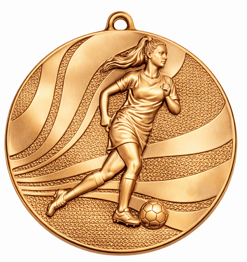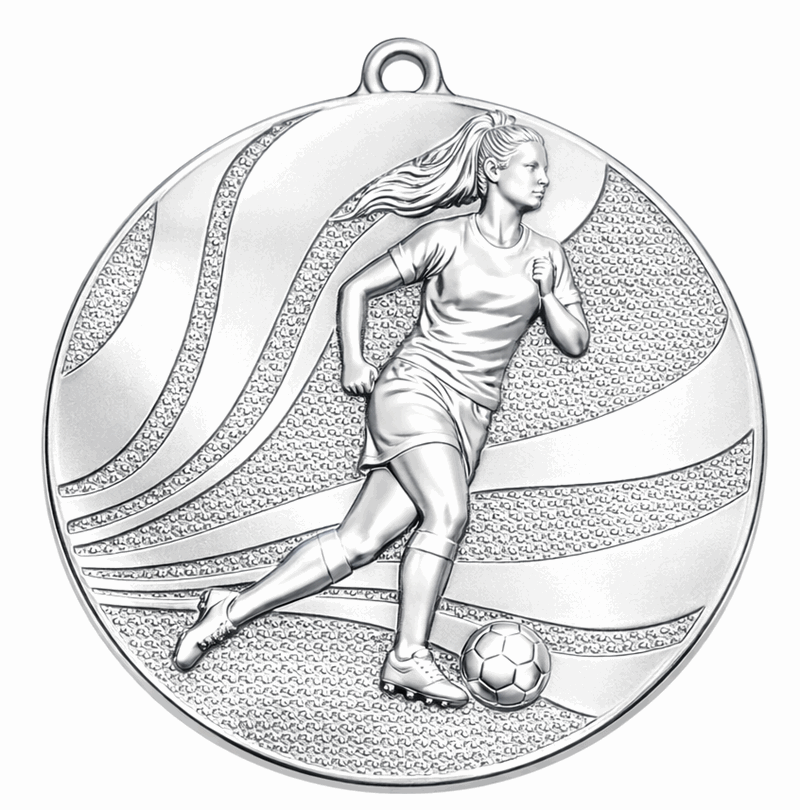 Ada medalje på 50 mm er en klassisk og stilren medalje som passer perfekt til premiering i konkurranser, arrangementer og idrettsstevner. Medaljen har en dame fotballspiller som motiv