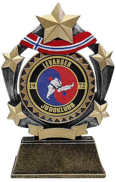 Farge: Gull/sølvstatuett med norgesfarger malt på statuetten