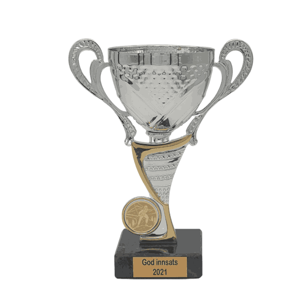 Materiale: Cup i metall, mellomdel i plast, sokkel i marmor med god vekt