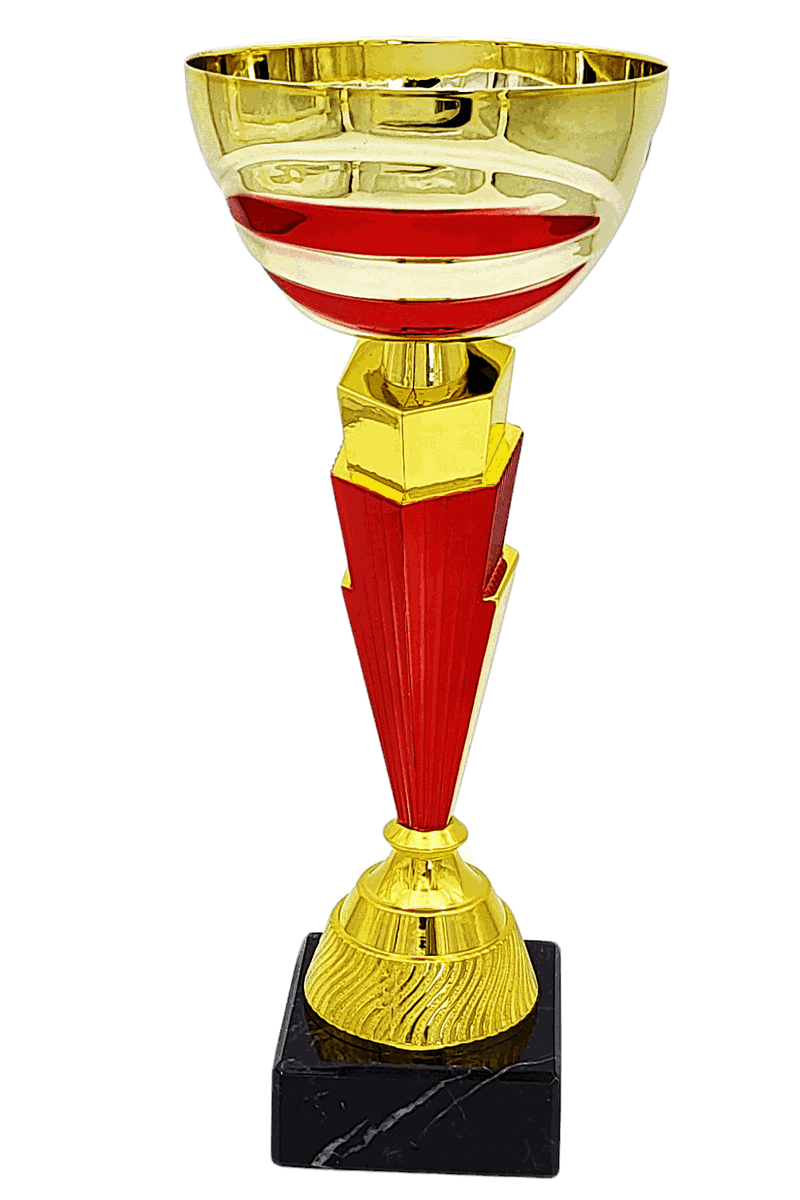 Farge: Gull og rød Materiale: Topp og bolle i metall, og mellomstykke i kunststoff montert på marmorsokkel