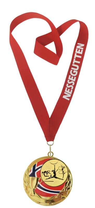 Rødstrupen medalje med tekst på bånd og turnmotiv