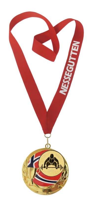 Rødstrupen medalje med tekst på bånd og vektløftermotiv