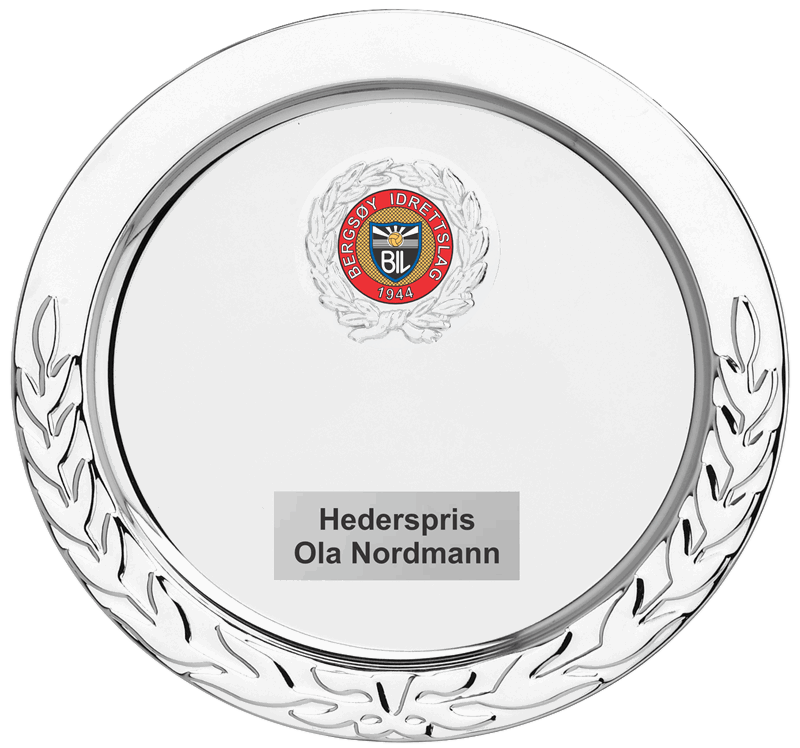 Metallfat i sølfarge med laurbærkrans langs kanten.