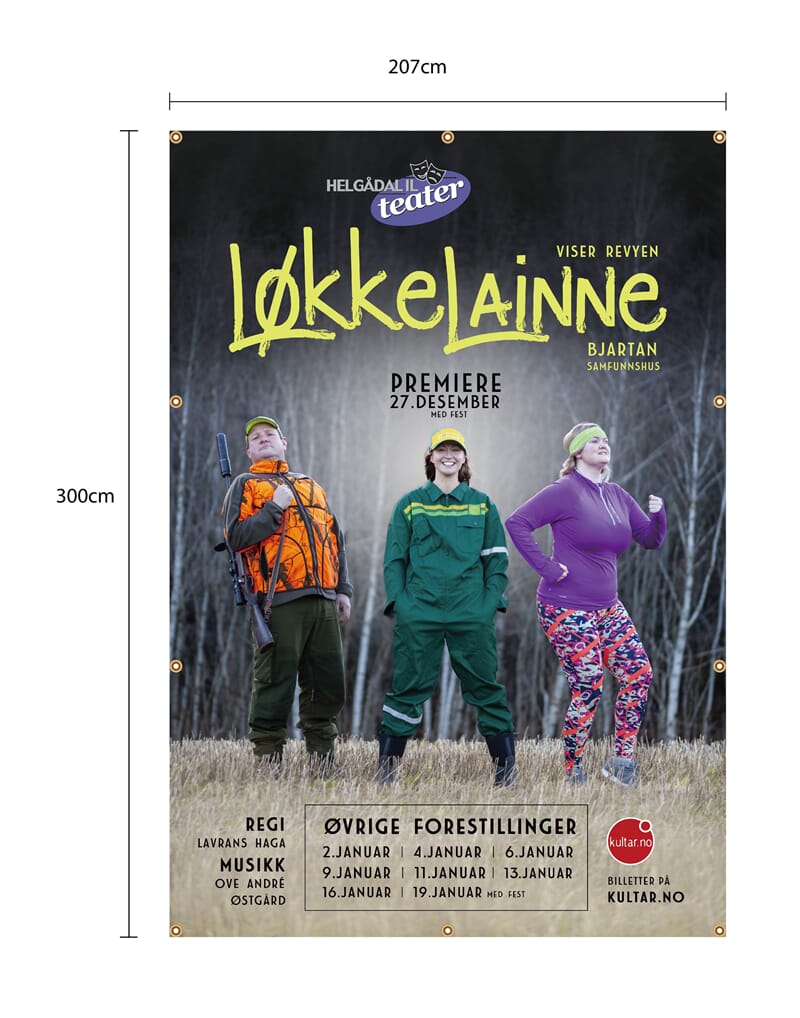 Dette banneret er levert til Helgådal IL teatergruppe sitt teater Løkkelainne.